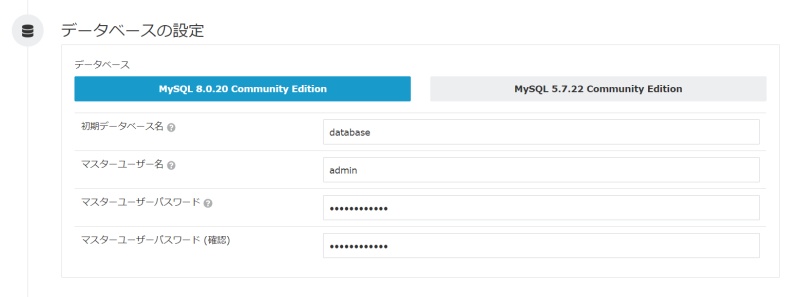 MySQLの設定を行います。現在、RDBが対応しているのはMySQL5.7とMySQL8.0です。