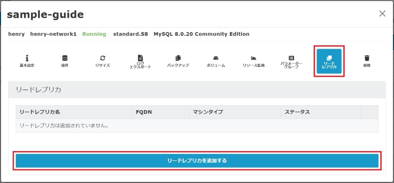 - 詳細モーダル上部から「リードレプリカ」タブを選択します。