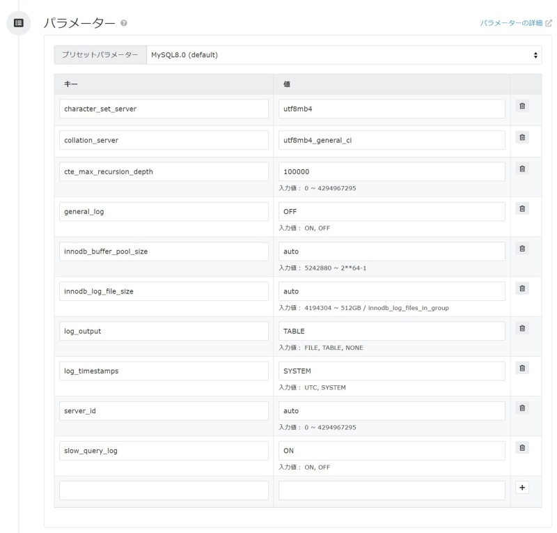 適用可能なパラメーターは、MySQL5.7もしくはMySQL8.0公式リファレンスマニュアルに記載されているmy.cnfの[mysqld]セクション内で適用可能なサーバーシステム変数です。