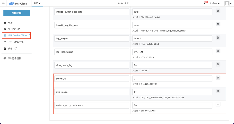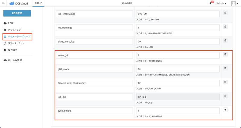 - パラメータグループからRDB(MySQL8.4)に以下を設定して再起動