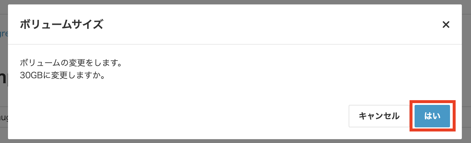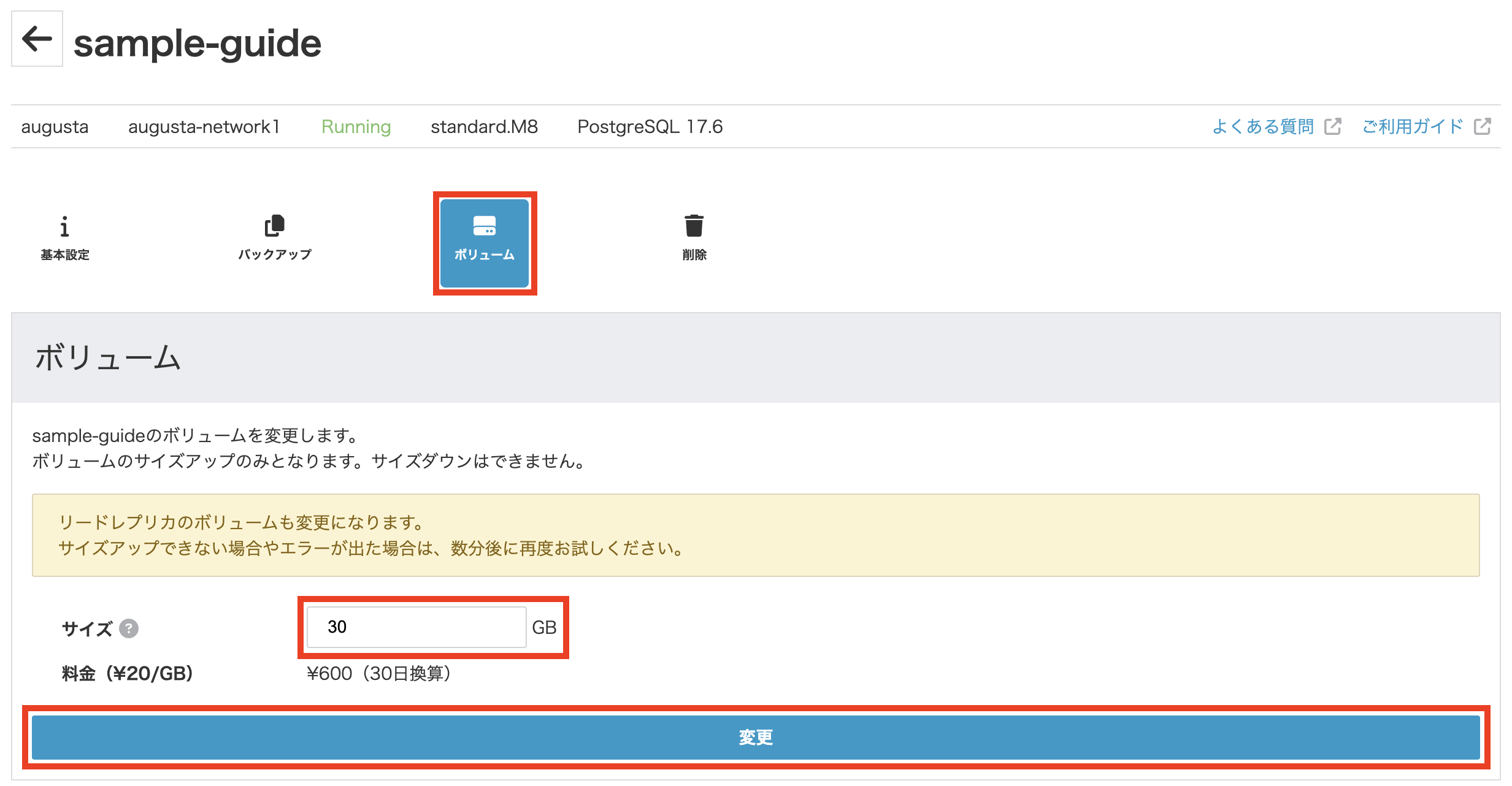 変更したいボリュームサイズを入力し、「変更する」をクリックします。(20GB~1,000GB)