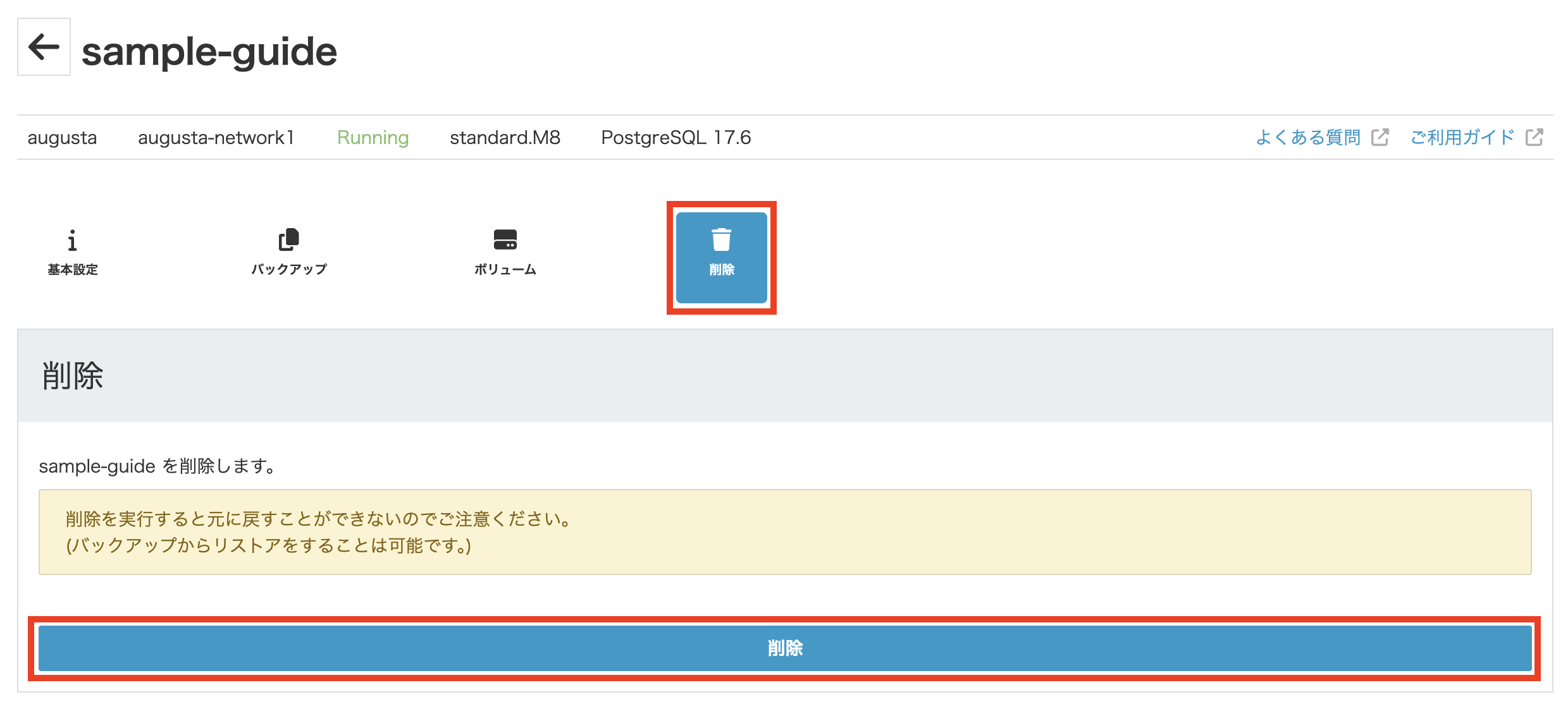 - 詳細画面上部から「削除」タブを選択し、「削除する」をクリックします。