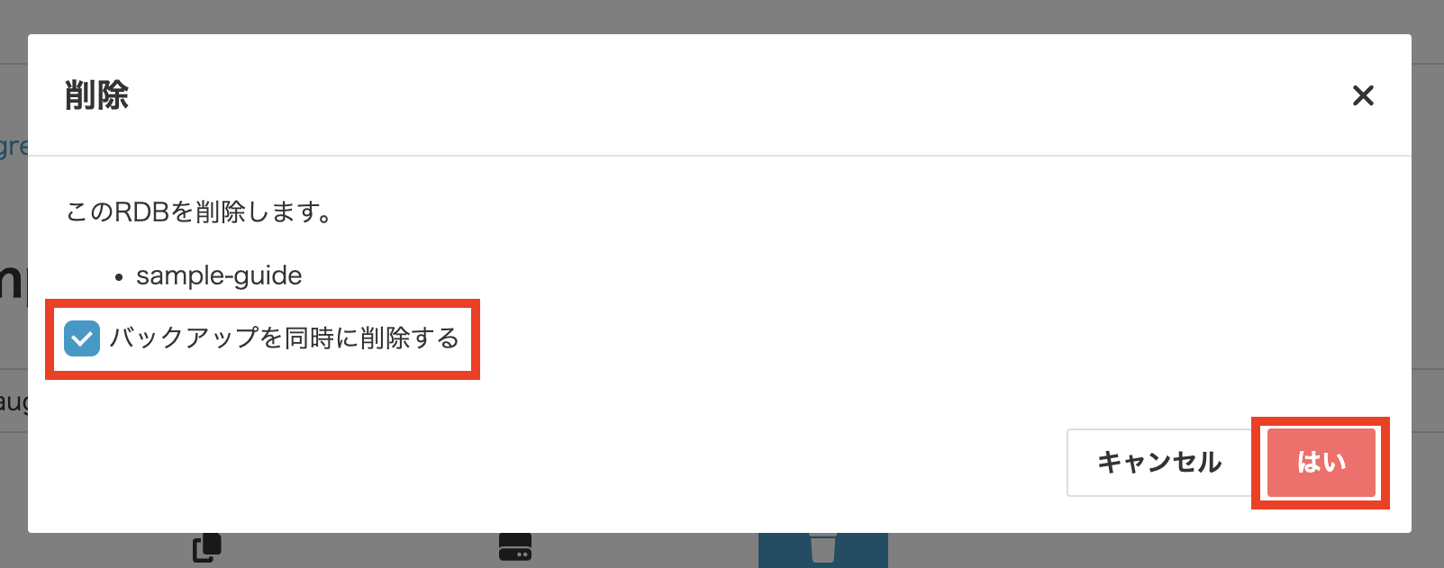 - 削除したいRDB名が正しいことを確認します。クラウドストレージに保存されているバックアップを併せて削除する場合はチェックボックスを有効にします。